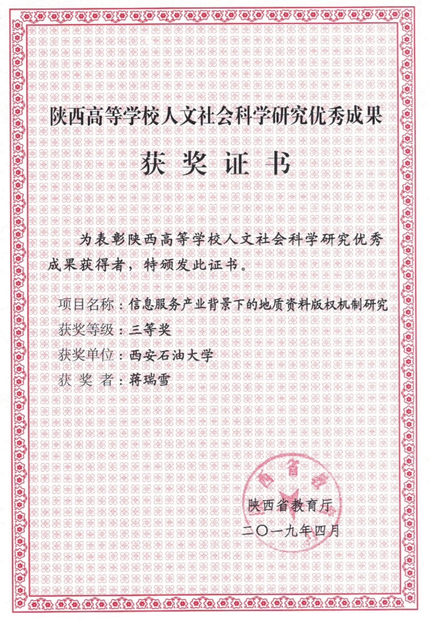 2019年陕西高等公司人文社会科学研究优秀成果三等奖(蒋瑞雪)