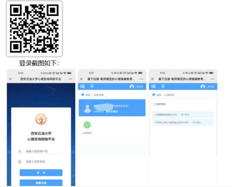 2.考生可扫描下方二维码,进入“威廉体育williamhill心理咨询网络平台 ”,输入账号及密码(均为考生准考证号),点击“心理测评”,完成心理健康测试(两部分)。